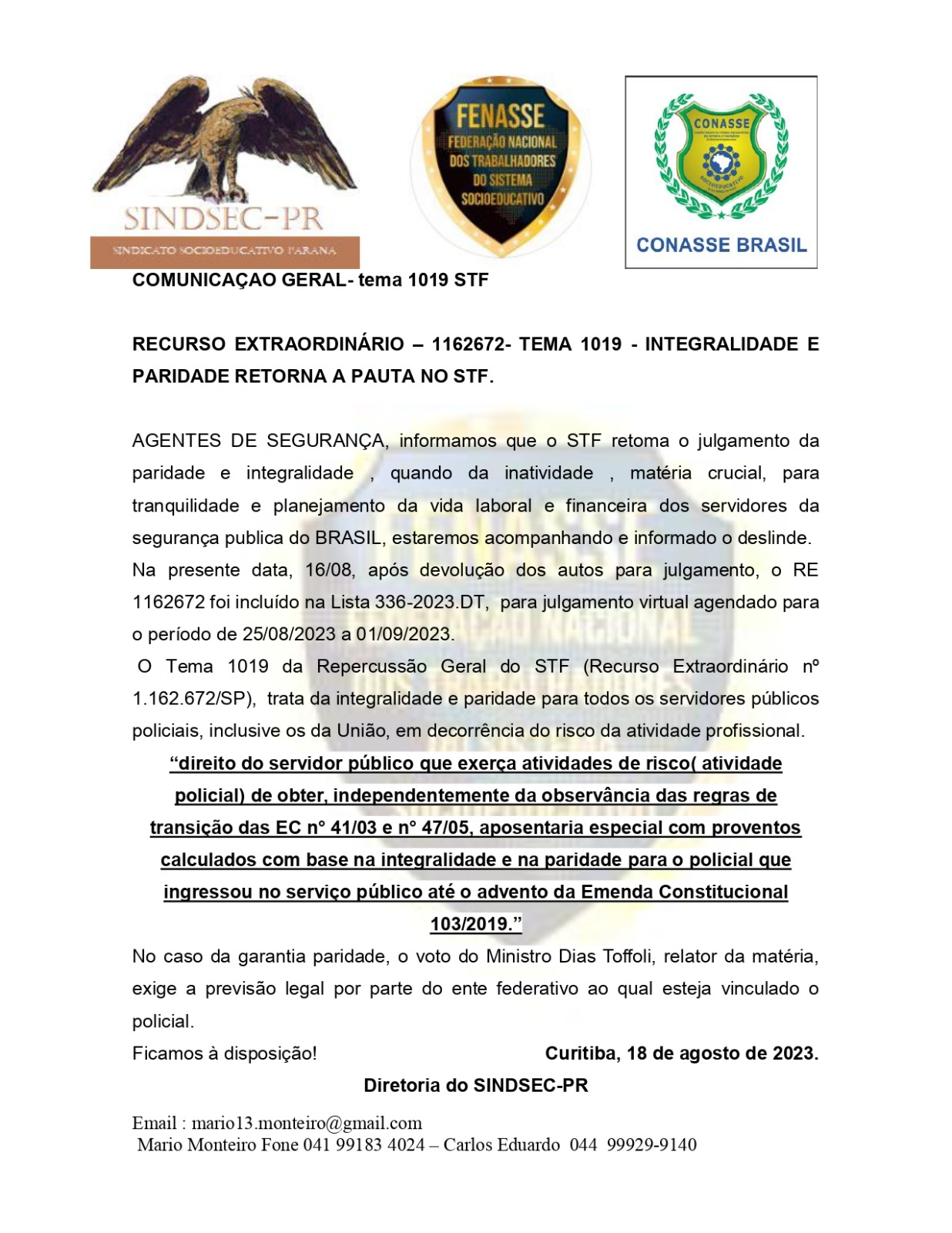 RECURSO EXTRAORDINÁRIO - 1162672- TEMA 1019 - INTEGRALIDADE E PARIDADE RETORNA A PAUTA NO STF. AGENTES DE SEGURANÇA, informamos que o STF retoma o julgamento da paridade e integralidade, quando da inatividade, matéria crucial, para tranquilidade e planejamento da vida laboral e financeira dos servidores da segurança publica do BRASIL,...
